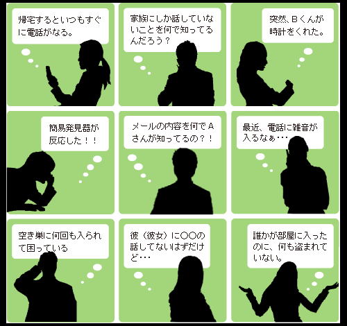 こんなことがあったら要注意!!このまま放置しておくのはたいへん危険です。被害を最小限に止めるためにも盗聴・盗撮の早期発見が重要です。まずは、お気軽にご相談下さい。